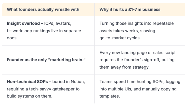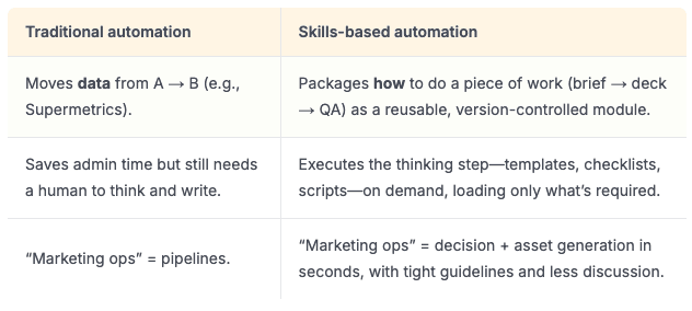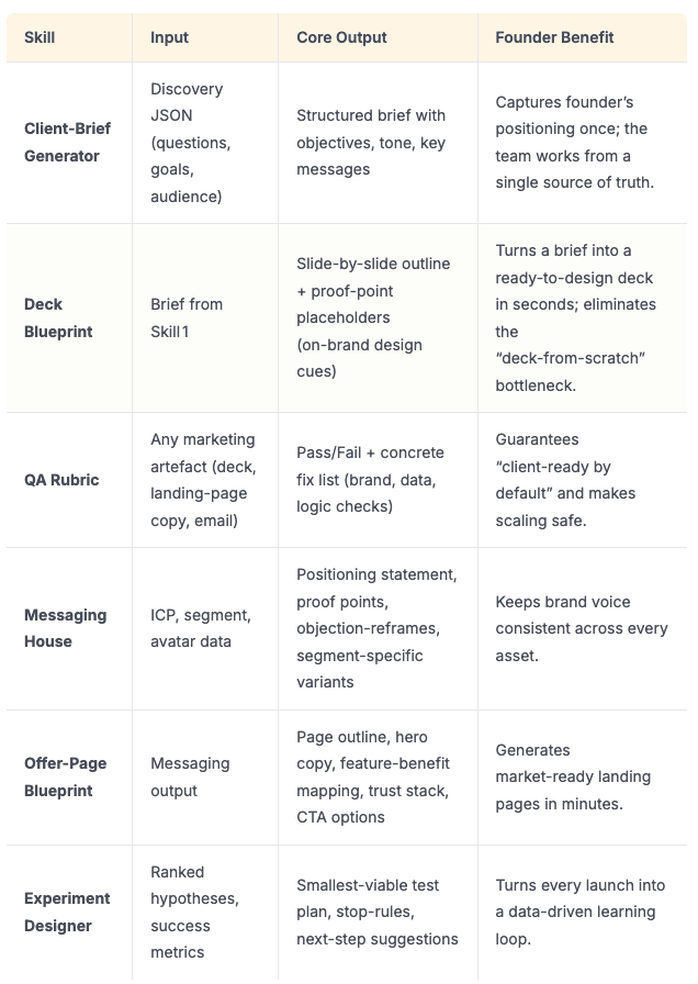 Why everyone's talking about Claude Skills?What it means for founders of medium-sized businesses “Imagine turning a mass of documents into a plug‑and‑play internal app that writes landing pages in seconds”You’ve spent years building the deep customer insights that now sit in a dusty Notion workspace or a folder full of PDF SOPs. Yet every new campaign or initiative forces you to re‑explain the brand voice, show them positioning framework, and chase someone in the team for the latest template. The result is weeks of overhead, a growth engine that stalls just when cash is tight. But more importantly, you can afford to stop being the “marketing brain”.