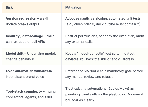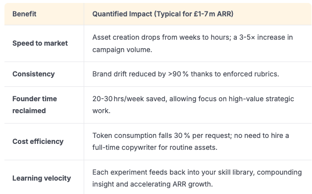 Because each step is a reusable skill, the loop can be executed by a three‑person team in hours, not weeks. Once this is working, you are freed up to focus on strategy, fundraising, or product roadmap while the skills driven pipeline churns out market‑ready assets daily. Skills help LLMs to move from chat to action“Progressive disclosure turns the AI’s context window into a JiT task compiler.” Traditional prompting forces you to dump all knowledge into the prompt, inflating token costs and risking hallucination. Skills act like a image lazy‑loader. The agent scans metadata, pulls only the relevant module, and compiles it on the fly. The practical implication is unlimited specialised knowledge without ever hitting the model’s token ceiling. For founders, that means you can maintain a library of hundreds of domain‑specific playbooks and still run each request cheaply and reliably. These can scale two or three times on your existing output and still use less token budget. 10. Risks, guardrails, and how to keep the system trustworthyBy treating each skill as a versioned artefact, you gain auditibility and rollback capabilities that traditional prompt engineering simply cannot provide. What this could mean for your bottom lineUber, Netflix, and Snowflake have already deployed autonomous Claude agents at scale, proving that this technology has impact, not a just AI poster boy of the moment. For founders at the £1‑7m ARR level the same capability is now achievable without a massive engineering team, just a well‑structured skill library. What's next? Build, test and deploy.